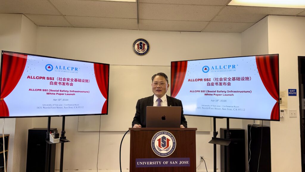 SAN JOSE, CA – April 19, 2026 – ALLCPR officially released its Social Safety Infrastructure (SSI) White Paper at the University of San Jose (USJ). As the highlight of the event, Dr. Claude Wang, Chairman of ALLCPR, delivered a keynote speech introducing the SSI framework and its significance for the future of public safety.
